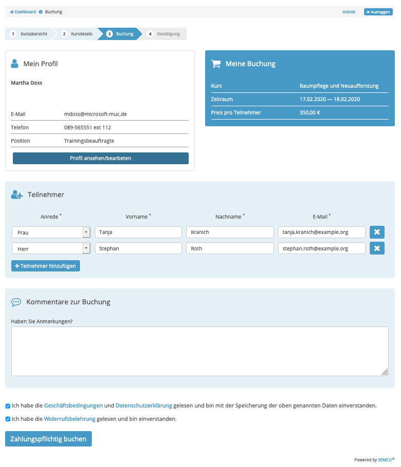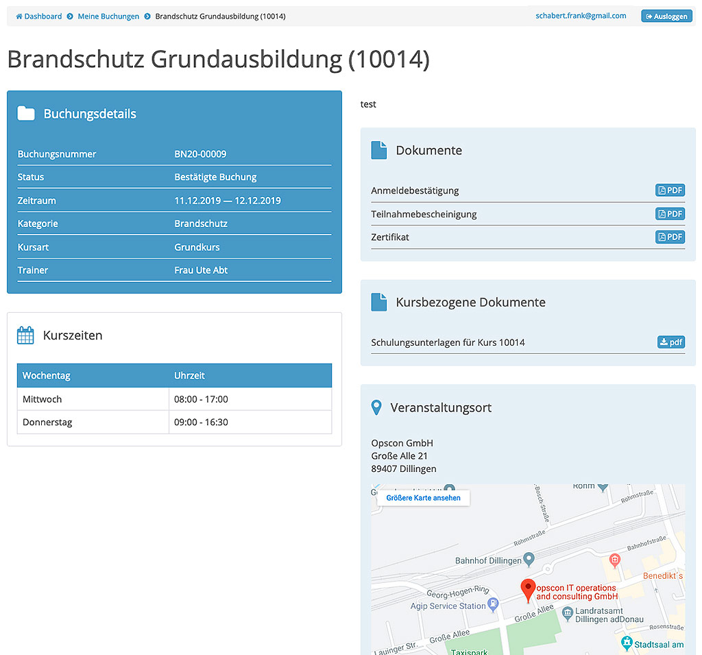 3. Und zuletzt kön­nen über die Por­ta­le Ihre Teil­neh­mer ihre bis­he­ri­gen Buchun­gen und alle für Sie im Rah­men der Buchung aus­ge­stell­ten Doku­men­te (Buchungs­be­stä­ti­gun­gen, Rech­nun­gen, Teil­nah­me­be­schei­ni­gun­gen, Zer­ti­fi­ka­te) online abru­fen.